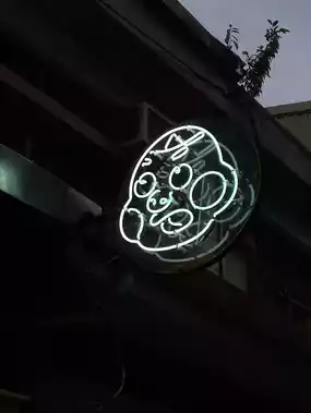 Among them, there is a cafe called egg host with a cute neon sign and a cat 🍳