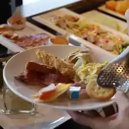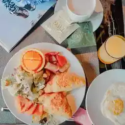 Beverages include hot coffee, tea bags, fresh fruit juices, milk and draft beer provided