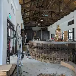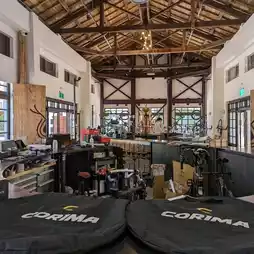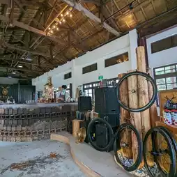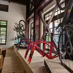 The elaine Nangang Bottle Cap Shop has a strong characteristic. It is a complex shop that combines bicycles and coffee. The various parts of the disassembled road bikes are cleverly integrated into the decoration and display, including the frame, chain ring, and wheel rim, combined with solid wood tables and chairs. The workbench is especially eye-catching. The gear-like metal hardware is assembled into an arc bar, which is like an installation art. Very cool!