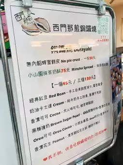 Dorayaki, located in the Ximen Wannian B1 food court, is assembled to order. The outer skin is as soft as a soufflé. The brown sugar milk contains pearls containing QQ. You can only taste the pearls if you eat it freshly. In addition, the taste of Oreo is also very good. Rich, the store also launches limited flavors from time to time, allowing customers to try new flavors. I have tried cocoa and cream before, and they are very delicious😋This is a high-quality dessert that you cannot miss when you come here.