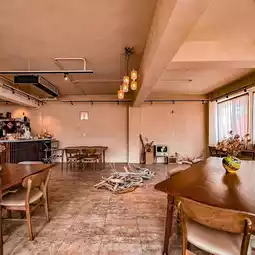 Desert-like wall color paired with dark wooden tables and chairs🪑