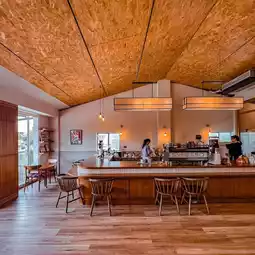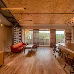 The upper floor is designed with light wood and the ceiling is high and bright🤩
