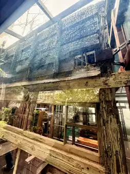 The remaining nine-row building with 19 households was the first large-scale public building during the Japanese colonial period. It used TR bricks produced by Taiwan Brick and was paired with Japanese wooden structures. After illegal constructions were demolished and a mysterious fire, the site has now become the Banyan Time Living Park. In addition to restaurants and cafes, the service center introduces the history and retains the wooden lattice doors from the Ministry of Justice dormitory period. The doors are not covered with Japanese paper but with layers of old newspapers. As they yellow and deteriorate, one can see the frugality and traces of time from the early years.