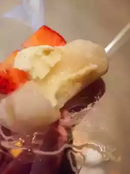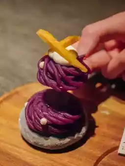 There are two crispy sweet potato strips on the top layer, and pearl-shaped sugar beads are used as decoration on the purple sweet potato puree. When eating, take off the upper layer first. The delicate and silky purple sweet potato puree is very rich. Then eat the chewy and soft outer layer of the Daifuku, which is made of black glutinous rice skin with bamboo charcoal added.