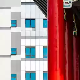 Framing techniques: Utilize archways, column gaps, or lattice windows to frame the Concert Hall/Theater, adding an oriental charm to the composition.