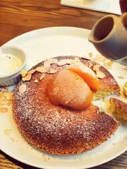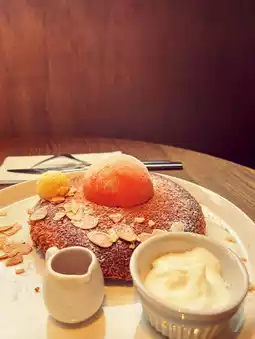 I ordered the signature original butterscotch thick pancake, which was made to order. It took 20 minutes to wait, but it was totally worth it! The texture of the pancakes is different from that of regular Japanese pancakes. Ranran's pancakes are crispy on the outside and solid and slightly moist on the inside. They are sprinkled with powdered sugar and topped with a large ball of what looks like orange ice cream, fresh cream, butter, and maple syrup. It is recommended for 1-2 people, but I ate it all by myself 😆 Very satisfying! With a cup of hot latte, your healing index will soar throughout the afternoon.