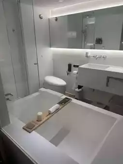 Temperature-controlled showers and anti-fog mirrors, with toiletries featuring "tea tree essential oil"—leaving hair soft and voluminous.