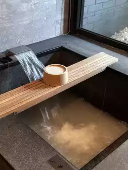 The hot spring room features a 'mini bar' offering free 'winter melon tea' and 'sparkling water.' Bring your own 'fresh lemon slices' to add to the sparkling water, and take a photo with the lush greenery outside the window. Caption it for social media: 'Life is worth it.'