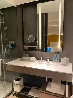 The room is dominated by warm gray tones, with retro leather case-shaped wardrobes and film-like chandeliers, detail control directly scream! The most courteous is the bedside with a negative-themed night light, at night turn on the light seconds into a miniature film exhibition ~ The bathroom adopts a semi-open design, marble countertop with matte glass, light through the grille, photography atmosphere pulled full📸