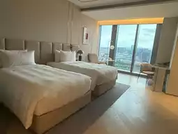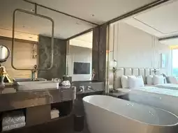 The room is incredibly spacious, featuring floor-to-ceiling windows with views of Taipei's cityscape. The bed strikes the perfect balance between soft and firm, making it feel like sleeping on clouds. The biggest surprise was the bathroom, which includes a separate bathtub and shower. The amenities are from a top-tier French brand, leaving a subtle fragrance on your skin after bathing. The mini-bar offers free refills, and if you get hungry at midnight, you can order 24-hour room service—hot and crispy salt and pepper chicken delivered right to your door!