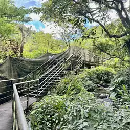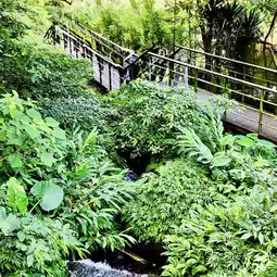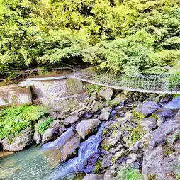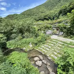 Take Bus 129 from Beitou MRT Station and get off at Top Lake Station. Walk towards Bamboo Lake, and you'll see the "Grass Mountain Waterfall Suspension Bridge" spanning over Huangxi Creek. This suspension bridge connects the Monkey Kan Ancient Trail and Shiba Irrigation Trail, enhancing the richness of both trails and offering visitors an exhilarating experience as if walking above the Grass Mountain Waterfall.