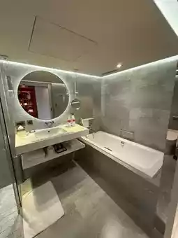 The bathroom has a separate wet and dry area and includes a bathtub.