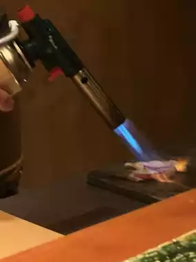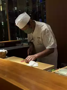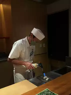บรรยากาศร้านหรูมาก แต่ไม่อึดอัด ตกแต่งสไตล์ญี่ปุ่นร่วมสมัย มีทั้งโซนซูชิบาร์ เทปปันยากิ เทมปุระ แล้วก็ห้องส่วนตัวสำหรับมากันหลายคน เราเลือกนั่งโต๊ะปกติแต่ก็ยังรู้สึกได้ความเป็นส่วนตัวดี