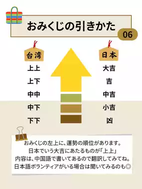 Even if you get a "Kyou" (bad luck), Taiwanese fortune slips provide appropriate advice on what to do next, so don't be too upset if you get "Xiaxia"!