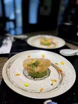Avocado 🥑 plus golden tomatoes, then served with grass shrimp 🦐, with a thin and crispy avocado texture, the middle shrimp crispy, prominent taste.