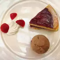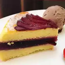 The top layer is pear slices pickled in red wine, the middle layer is red wine and pear jelly, and the top and bottom are almond cakes. It is served with a scoop of rich chocolate ice cream, fresh cream and fresh strawberries, giving it a different level of taste.