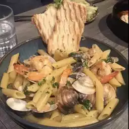 Fresh shrimp and clams, with Romano cheese and penne pasta. (You can choose between anchovies, lemon, olive oil and spicy sauce, or Italian tomato red sauce). We chose anchovy lemon olive oil, paired with clams and fresh shrimp, a little spicy, a completely Mediterranean-flavored penne 🍝
