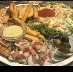 Classic Israeli hummus, with suet-fried shawarma-spiced chicken, onions, fresh basil and homemade harissa sauce. The chicken is tender and well-spiced. Wrap the hummus and chicken in pita bread and enjoy it together. It is smooth and full of exotic flavor. If you like lamb, I recommend Moroccan lamb hummus👍