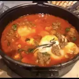 Moroccan poached eggs, with special onion tomato sauce, minced lamb cooked with Mediterranean spices, carrots, peppers, etc., and sprinkled with pine nuts. It is really delicious and a very classic Middle Eastern dish🥘