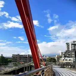 Rainbow Bridge is a suspension bridge located in Taipei, Taiwan. It is the longest suspension bridge in Taiwan, spanning a length of 1,092 meters. The bridge was completed in 2000 and connects the districts of Xinyi and Songshan in Taipei. It is a popular spot for taking pictures, especially at night when the bridge is lit up in a rainbow of colors. The bridge is also a popular spot for cyclists and joggers, as it is connected to the Taipei Riverside Bikeway.