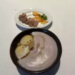 It is presented with quail egg yolks, duck-shaped taro cakes and cherry shrimp.