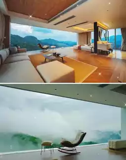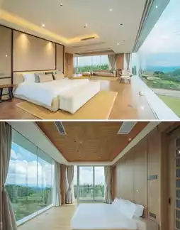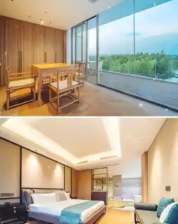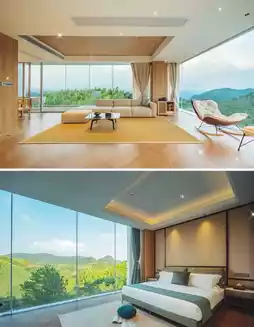 This spacious property features only 8 uniquely designed rooms, each offering distinct views. Ranging from 40 to 100 square meters, the rooms boast floor-to-ceiling windows, with the largest being a single 13m×3m glass panel that seamlessly blends the outdoors in. Wake up to automated curtains revealing misty bamboo forests and distant mountains, as if stepping into a painting.