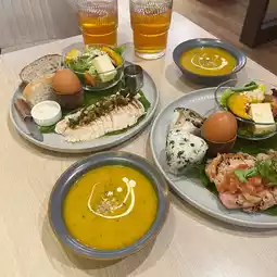 The lighting is very comfortable in this brunch spot. Although the interior isn't very large, the seating is quite cozy. There are many options on the menu, and the portions are generous when served. The food isn't too heavy, which I appreciate. I really like their bread; it's dense yet soft, making me want to take some home. Eating in such a wonderful space is very relaxing. It was a great day!