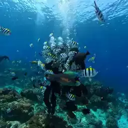 Then suddenly a large bullfish appeared. Its size gave me a slight scare, but it slowly glided past me, looking handsome and majestic. There is also a group of colorful tropical fish swimming around, which looks like a scene from an animated movie, it is totally unreal!