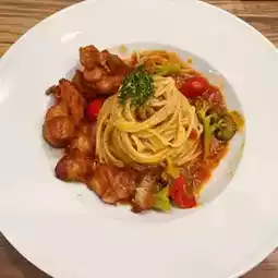 A newly opened spaghetti restaurant is crowded and free of charge french fries and offers are really full of cost-effective things will not be too expensive very suitable for friends to gather oh the environment space is very bright and comfortable if you want to eat cheap spaghetti can come here to eat oh