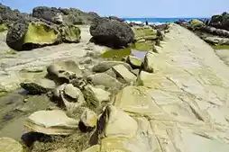 The fourth geological park in Taiwan, the Eastern Coast Fugang Geopark covers an area of about 6 square kilometers. Here you can see soft and hard sandstone, shale interlayers, and inclined strata. Due to the weathering of the rock strata, various strange rocks have been created. Among them, the big-eyed frog, camel rock, and turtle rock are the most famous. It is one of the must-photograph landscapes when visiting Xiaoyeliu.