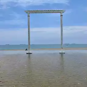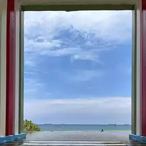 Through this gate, you can see people playing on the beach