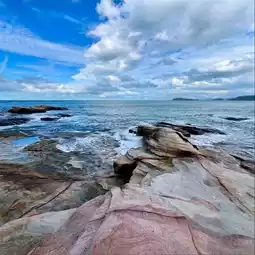 The rocks here are wild, honeycomb shapes, tofu-like layers, seaside cliffs and tide channels all blending together. It is extra scenic with the Twin Candlestick Islets visible in the distance. The hike is short but slippery in spots, so wear good shoes and keep an eye on tide times, high tide can block the cave exit.