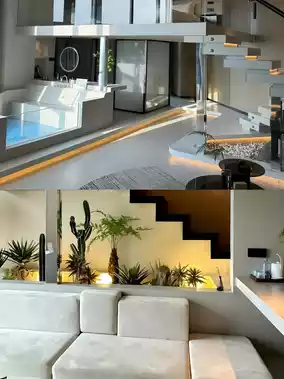 The room has a bathtub 🛁 and the bed is on the second floor loft. From the bed, you can see the outside view, and in the afternoon, you can see the sunset over Jinyang Lake 🌇