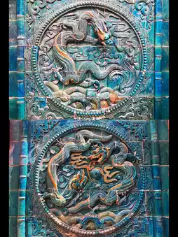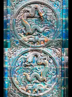 The magnificent palace walls at the entrance, the screen wall, in the center of which is inlaid with a square glazed tile with a pattern of flowing clouds, sea water, and twin dragons playing with a pearl, made of yellow, blue, and green glazed tiles.