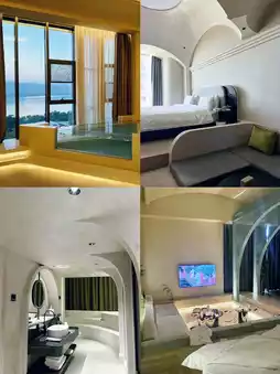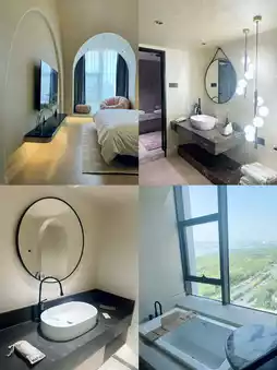 The room is very stylish, with two large projections, great viewing experience, and a bathtub. Friends who like bathing must come here. There is also a cafe with a beautiful lake view, which can also be seen partially in the room.