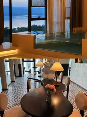 The public area offers free afternoon tea and fruit. Sit on the sofa with friends, drink tea, chat, and watch the sunset over Jinyang Lake. It's so relaxing!