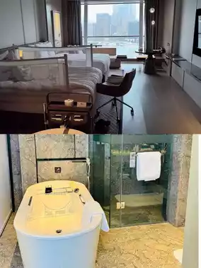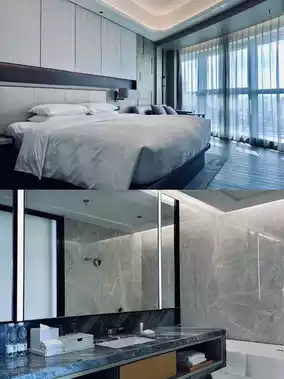 There are Chinese paintings in the foyer, the living room is very large, the bedroom and bathroom are semi-open and connected, you can see the fireworks outside at night. By the way, the only regret is that I didn't sleep well, the fireworks were set off until four in the morning