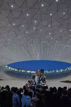 We explored a corner of the botanical garden and didn't see many impressive old trees. Also, Taiyuan's altitude is a bit higher, so the temperature wasn't quite right, and not many flowers were in bloom. As a result, there weren't many people wandering around the edges of the botanical garden. Most people were gathered in the three greenhouses and at the sightseeing elevator—where the 50 RMB experience is concentrated! In the hour before closing after sunset, the line for the sightseeing elevator was dozens of meters long. Personally, I didn't find it very amazing, and it was crowded. When buying tickets, we also got a combo ticket for a theater performance. Unexpectedly, the 10 RMB performance felt like it was worth 50 RMB. Qiqi kept excitedly shouting, "Wow, this is so wonderful! This is the first time I've seen a theater performance, it's so good..."