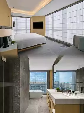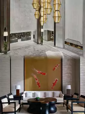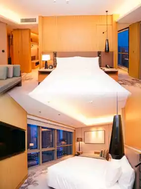 The hotel lobby boasts a modern and luxurious design, with high ceilings and artistic decorations creating an elegant ambiance. The rooms are spacious and bright, featuring floor-to-ceiling windows offering panoramic city views. Comfortable bedding, separate dry and wet areas in the bathroom, and high-end toiletries complete the luxurious experience.