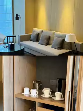 The suite we stayed in this time has an area of 65㎡ and a reasonable layout. The room is located at the corner, and the double-sided floor-to-ceiling windows in the bedroom offer panoramic views of the city.