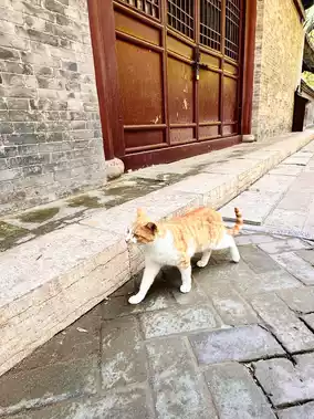 Even more delightful, a few plump kittens lounge lazily in the sun or leap chasing falling leaves, adding a lively touch to this scene full of ancient charm.