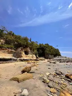 It's a very fun beach with white sand, steep sea cliffs, blue skies💙 and caves🫧You can even play on the rocks🦀