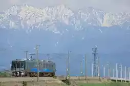Next to Himi Station, there is a three-story commercial complex with an observation deck on the top floor. It is a photo spot for capturing the Himi Line train and the Tateyama Mountain Range together.
