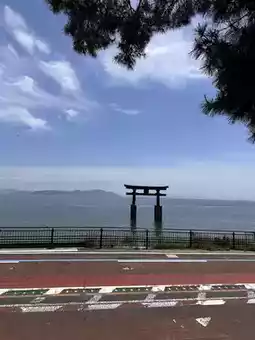 The torii gates stand on Lake Biwa across the road from the shrine, but it is forbidden to cross the road from the shrine, so you can view them from the observation deck.