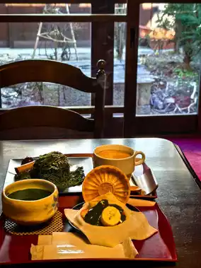 Their signature dish is Temariyaki, a waffle filled with mochi (rice cake), matcha soup, fruit, etc., sandwiched together to resemble a traditional temari (handball) craft. It's super cute!