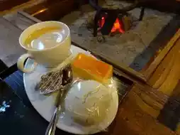 One of the charming features inside is a mock fireplace, which adds a lovely rustic touch and makes for a great photo opportunity. The whole place had a warm, welcoming feel—perfect for a short stop while exploring the old town.