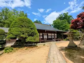 A serene and peaceful Nichiren Buddhist temple, Hokkeji Temple features a main hall, a Prajna Hall connected by a corridor, and a small pond in the foreground. Additionally, there is a small shrine where locals come to pray daily.