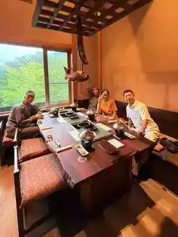 All meals at Takumi no Yado Shinyama Sakuraan are served in the second-floor dining room of the main building. The restaurant's high ceilings give it a spacious feel, ample seating, and a lively atmosphere.