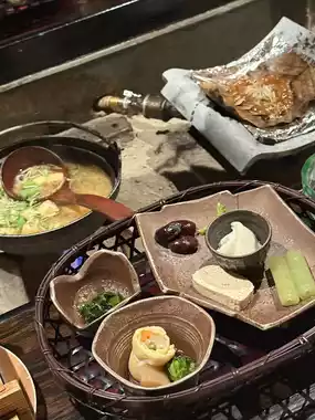 Meals are a highlight here. Dinner and breakfast are served in a private dining room with an irori, a traditional sunken charcoal hearth, where local Hida beef and mountain vegetables are grilled and served with care.