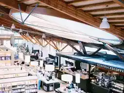 The open, atrium-style space has a design that gives off a warm wooden vibe 📚✨